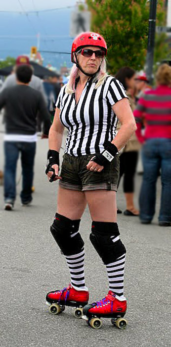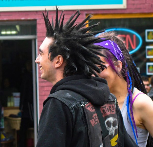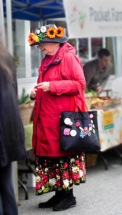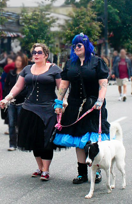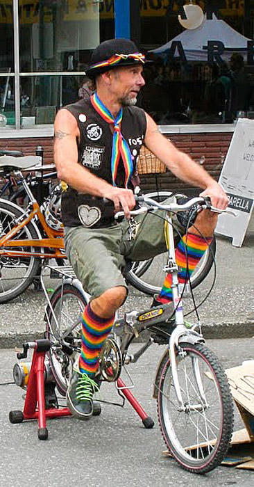 Car free day is when anyone and everyone sets up stalls on the street, and people dress up crazy, and ride weird hand built bikes or a big black mechanical spider, or do street performances, or play music. There was an African choir, and some blues musicians, and a great rock singer, and a singer who sounded like a young Joni Mitchell. There was a group of kids doing a performance with giant muppets. Roller Derby girls giving demonstrations. Spinners spinning in front of the wool shop. And a sound system powered by riding a bicycle. I saw a woman well into her seventies totally rocking out to the blues music (as I did myself), and a big crowd singing along with the African choir. Food stalls, and jewellery stalls, and clothing. A stall promoting backyard chickens now they are again legal in Vancouver, and all the different “Land Rights for Gay Whales” and save the environment stalls. And the crowds wanderd up and down taking it all in, like a big party.