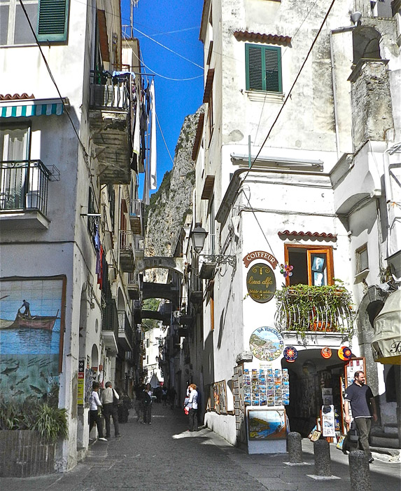 The bus trip to the town of Amalfi, along the famed Amalfi Coast road was stimulating. It’s a very narrow winding cliff-hanger of a road with spectacular views. Don was completely relaxed. I was a bit tense. It reminded me somewhat of a time in Vietnam. We’d been hiking through the mountains all day and got a ride on the back of motorbikes back to the town we were staying in. I was handed a helmet that had no inner lining, was way too big, and the strap couldn’t be adjusted. It was like having a metal bowl sitting on my head. Very narrow roads full of ruts and potholes. Crazy traffic. I sat on the back of that bike and handed my life over to the gods. The Amalfi coast was quite tame really after that, but it didn’t stop me tensing a little every time the bus went round a blind curve. Which was often. And we got the very front seats in the bus so could see everything. Including all the blind curves. Fabulous!