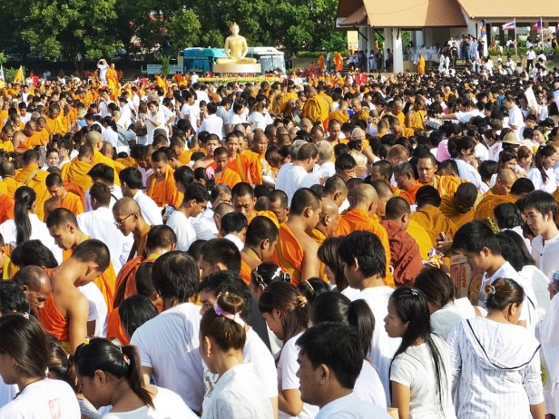 Many many Thai people, all dressed in white, gathered to give alms to the monks in celebration of the 2600th anniversary of the Buddha’s enlightenment.