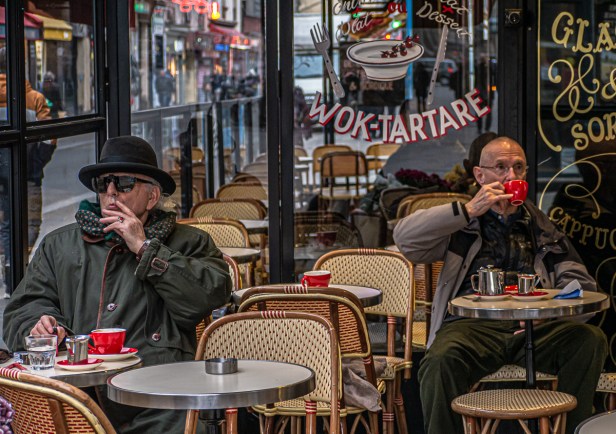 The first time we sit at the table nearest the wall of the café. Along comes a man who, with obvious anger, pulls out a chair at a table in front of us. We are sitting in his seat! I stepped out to take a photo of a couple of old dudes drinking coffee. The hat, the scarf arranged just so, the coat, the cigarette! French style at its finest!