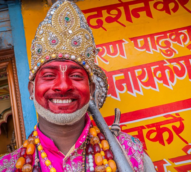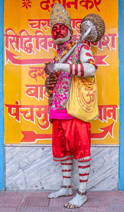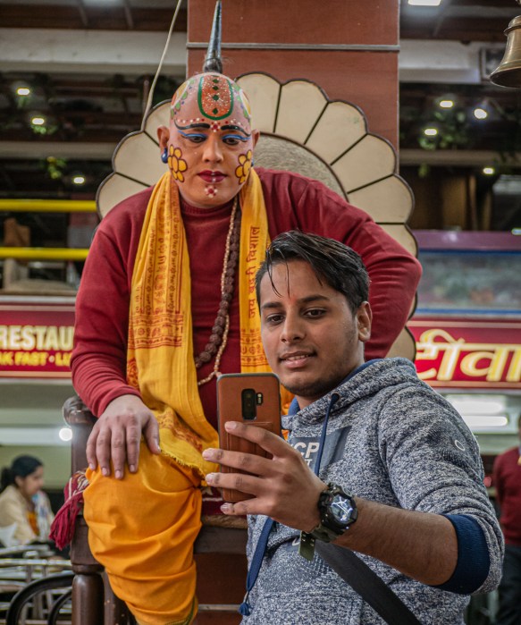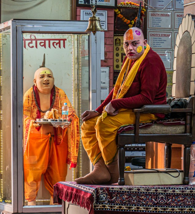 There is a chain restaurant in India called Chotiwala. A choti, or sikha, is the small area of hair remaining on the back of a shaved head to help with connection to the divine. Thus the symbol for the restaurant chain is a cartoon-like image of a well-fed man with his choti gathered into a kind of spike sticking up from the back of his head. There are three Chotiwala restaurants in Rishikesh, two side-by-side, and a third across the river. At the entrance of each of the two that are side-by-side there is a man dressed in a traditional golden dhoti, each with a spiked choti and elaborate face make-up. The make-up is different each day, except one of the men always has a pink face. And there they sit all day. It is their employment. Sometimes Indian tourists stop to take a selfie with them. Otherwise they sit there, living symbols silently welcoming people into the restaurant. I worry about them getting skin cancer.