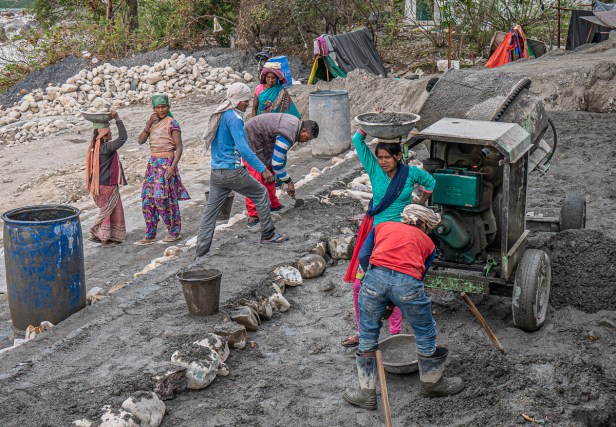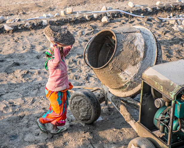 There was a cement mixer powered by a generator and there were several people, both men and women, who were carrying pans of sand on their heads to the cement mixer, back and forth in an endless loop feeding the machine.