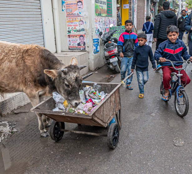 It’s pretty apparent that most of the cows here are not very healthy. It’s very sad to see. Rishikesh, at least, has largely banned single use plastic so that’s something of an improvement, but still it’s clear the cows are not fed well.