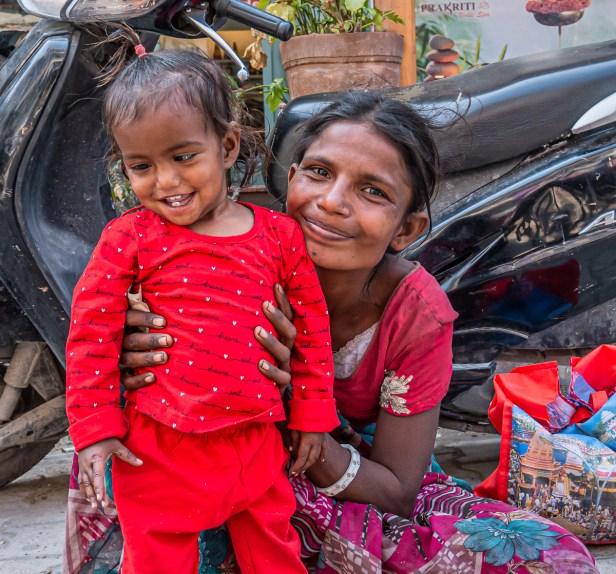 We’ve continued doing this in Rishikesh. Like the street vendors, the beggars have their spot and since we walk more or less the same route every day we support the same people. A young mother with such a heart-breaking depth of sadness and desperation in her eyes that I can hardly bare to look contrasts with a man who has lost a leg. When Don asks him how he is he puts his hand on his heart, smiles widely, says he’s fine, and points to the sky, to God. All is well. And then there is the quite badly deformed woman who has a smile that outdoes the sun when she sees us. And this young mother with her sweet child, who, like most Indians, is delighted to be photographed.