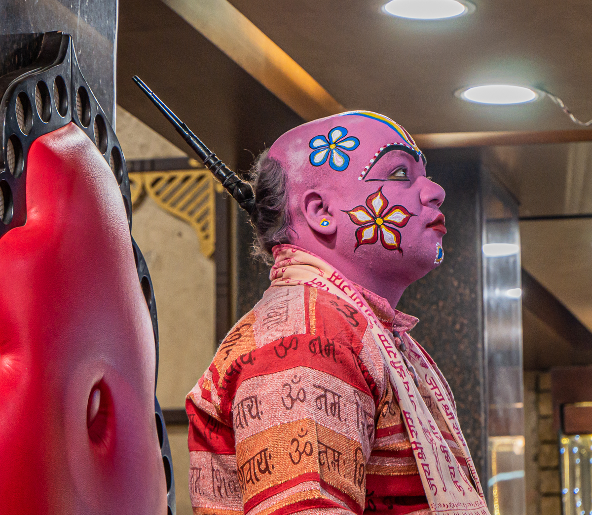 There is a chain restaurant in India called Chotiwala. A choti, or sikha, is the small area of hair remaining on the back of a shaved head to help with connection to the divine. Thus the symbol for the restaurant chain is a cartoon-like image of a well-fed man with his choti gathered into a kind of spike sticking up from the back of his head. There are three Chotiwala restaurants in Rishikesh, two side-by-side, and a third across the river. At the entrance of each of the two that are side-by-side there is a man dressed in a traditional golden dhoti, each with a spiked choti and elaborate face make-up. The make-up is different each day, except one of the men always has a pink face. And there they sit all day. It is their employment. Sometimes Indian tourists stop to take a selfie with them. Otherwise they sit there, living symbols silently welcoming people into the restaurant. I worry about them getting skin cancer.