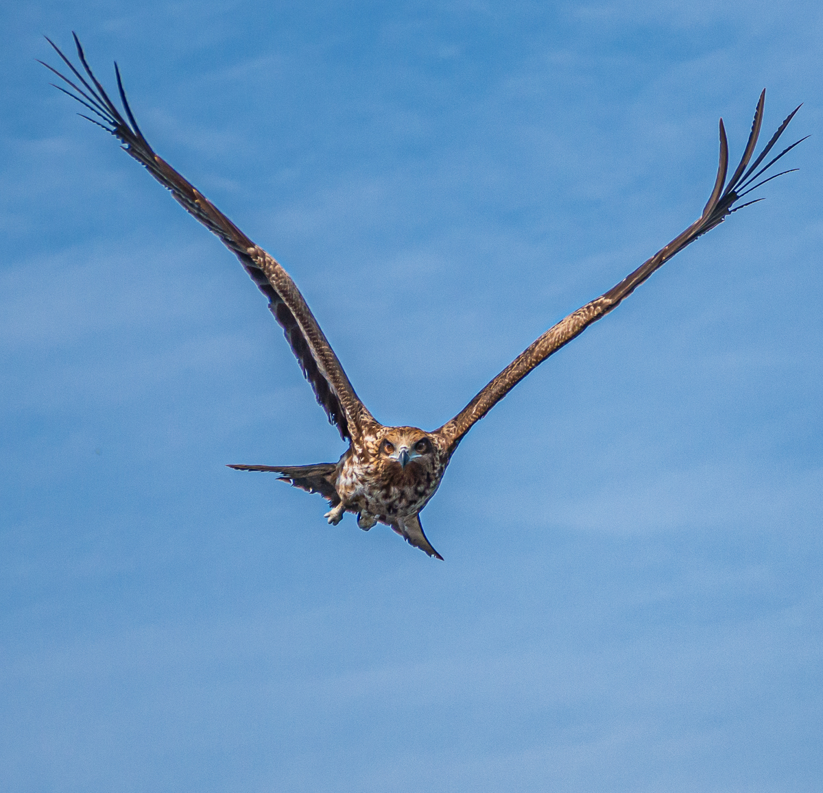 standing on the open deck of the boat, and people with birdseed are holding their hands high and the eagle hawks come diving in, so close I can almost touch them.