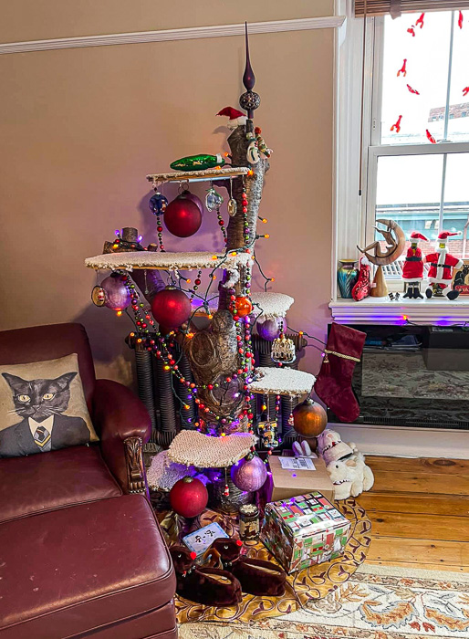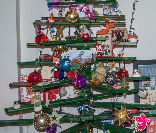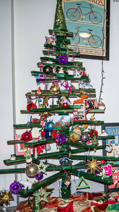I’d offered to cook the Thanksgiving turkey, which of course meant dinner would have to be at our place. Everyone seemed pleased that I offered to do the same again for Christmas. But decorating. That was another matter. I had no energy for stringing lights. And what about a tree? It’s Christmas! We had to have a tree! I hate those fake trees that try so hard to look like the real thing and never do. I toyed around with the idea of creating my own after having seen this fabulous and unique creation from our friend Don,