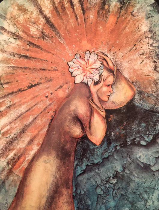 It looks hopeful to me – I’m leaning forward into it, being very serious about it, but at the same time carrying on my shoulder something that looks like a luminous flower radiating out to infinity and giving me energy, strength, and encouragement. There’s a confidence and a sense of rightness about it. But we’ll see. It all feels like a bit of a fantasy at the moment.