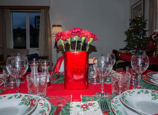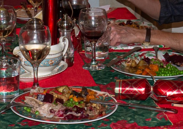 Bit by bit dinner came together. The turkey came out of the oven and the dishes the others had brought went in. Peas were cooked. Gravy was made. Shenanigans happened – who cares if there’s no mistletoe, there’s shiny balls and that’s just as good.