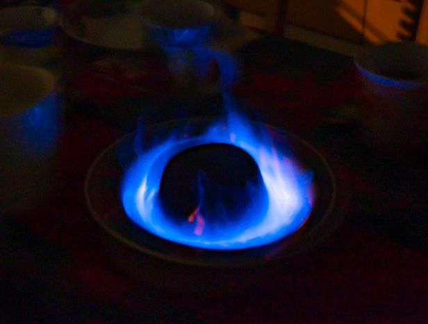 At last it was time for dessert. I’d offered to provide dessert because I really wanted a traditional, as in British traditional, Christmas pudding with all the trimmings.