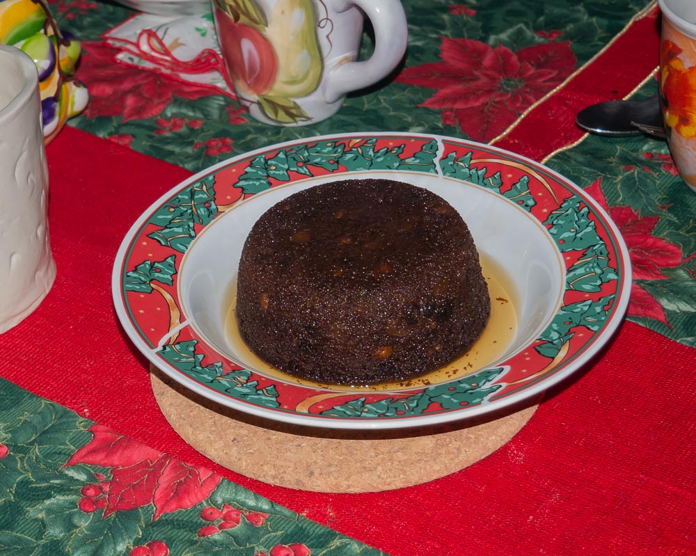 At last it was time for dessert. I’d offered to provide dessert because I really wanted a traditional, as in British traditional, Christmas pudding with all the trimmings.