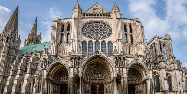 Cathédrale Notre-Dame de Chartres is built on the highest point in the area, a site that has been a place of worship since ancient times. There was a Celtic temple, a Roman temple, then five – five! – cathedrals since Chartres became a Bishopric in the fourth century. The cathedral that stands today was built from 1205 to 1270. We were held in thrall by this extraordinary building for almost two hours. There are the two contrasting steeples, flying buttresses, hundreds of sculpted figures depicting theological themes and stories, and both Romanesque and High Gothic sculpted portals. And that’s just the exterior.