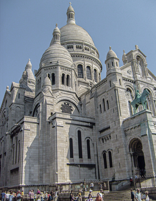 Sacré Coeur sits like a confection of white meringue against the sky. This Roman Catholic Basilica is located on the summit of the highest point in Paris, the Mount of Martyrs (Montmartre), a place that has been a site of worship since the time of the Druids. It was built between 1875 and 1919.