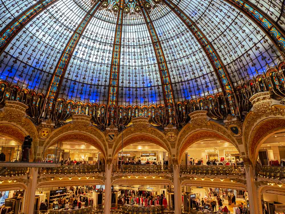 It took a long time and many visits for Galeries Lafayette to get to the top of my Paris wish list. I didn’t understand why a department store would be a tourist attraction. Back in 1893 two cousins decided to establish a novelty store on Rue La Fayette. They called it Aux Galeries Lafayette. It was a great success, and after the purchase of several adjacent buildings and years of refurbishing, the ambitious and enormous Galeries Lafayette was officially opened in 1912. The architects designed the Art Nouveau store around a glorious neo-Byzantine 43-metre high dome. When I finally see it, it literally takes my breath away. I hardly know how to hold such splendour. How does one take it in, this artistic and creative brilliance? I can only stare in gratitude for such beauty. If all department stores looked like this I might go shopping more often.