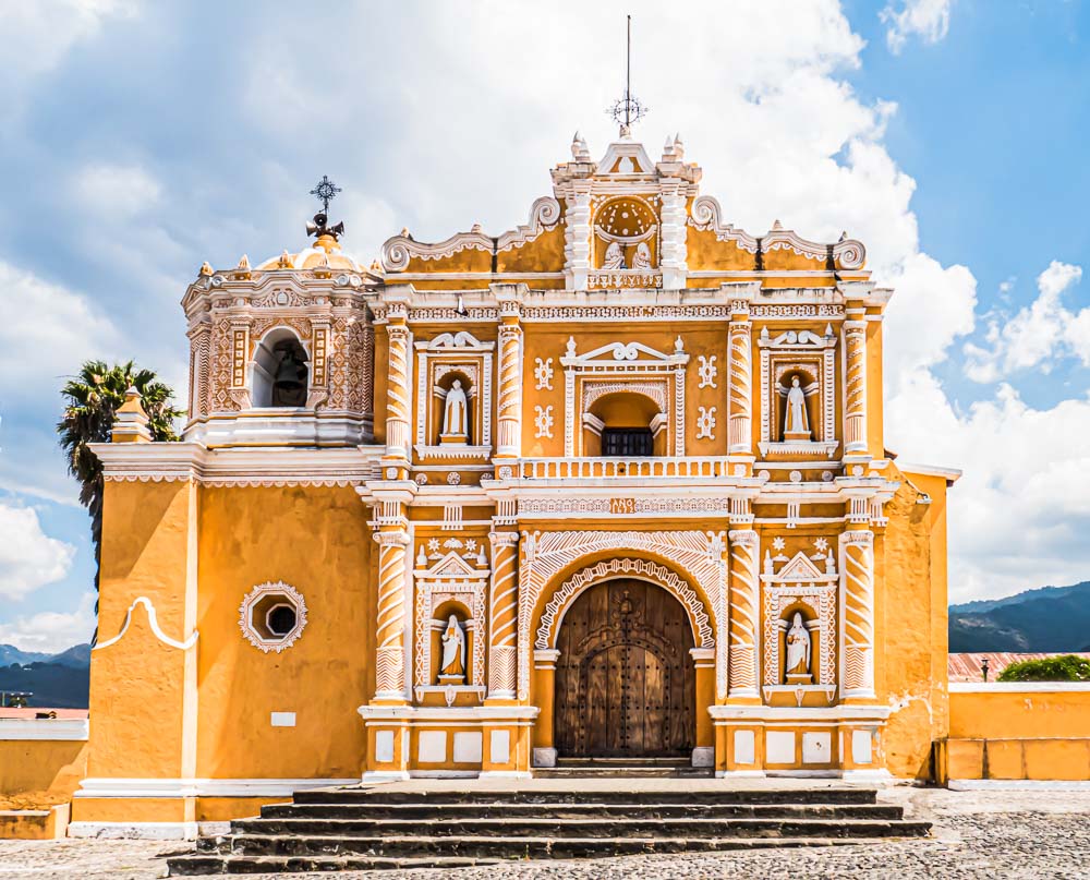 From Sagrada Familia, one of the grandest cathedrals in the world, to a modest village church. In San Pedro Las Huertas, a short distance from Antigua, we are impressed by the bold colour and beautiful Baroque details of the local church.