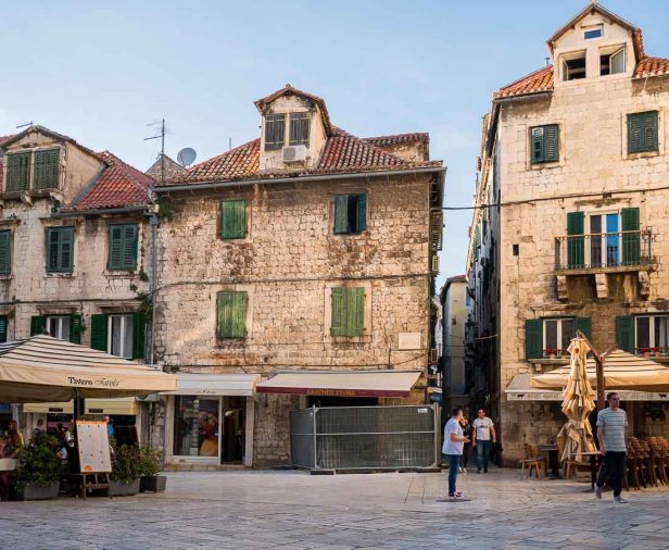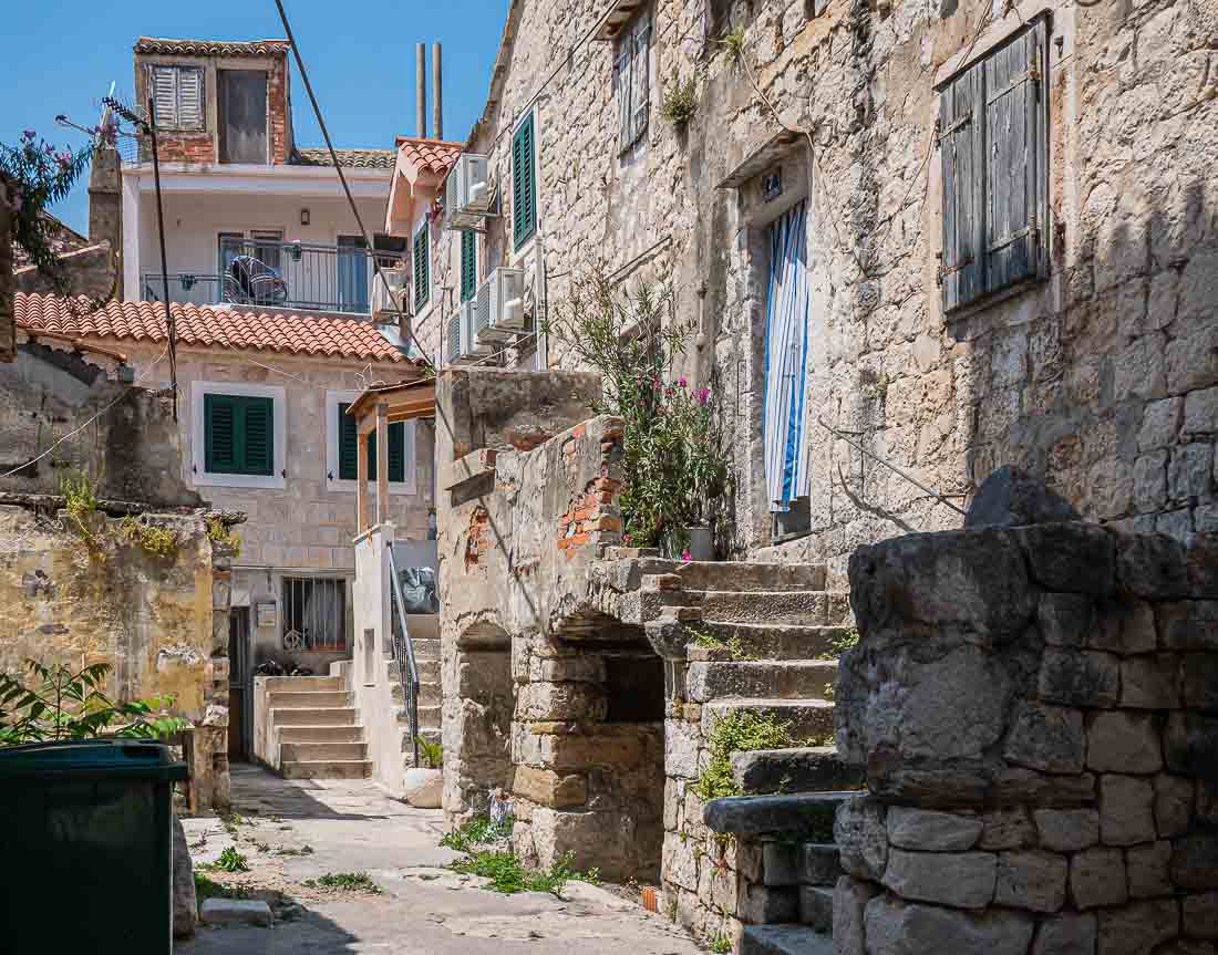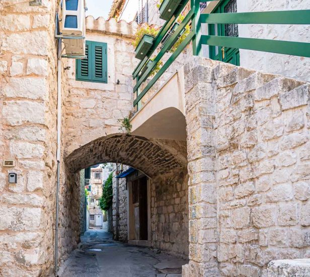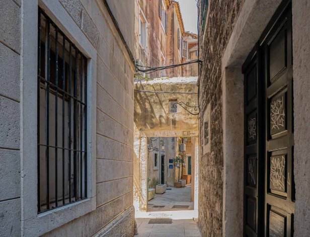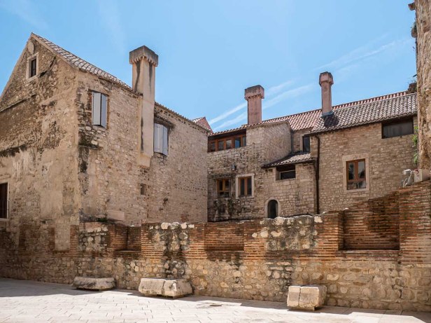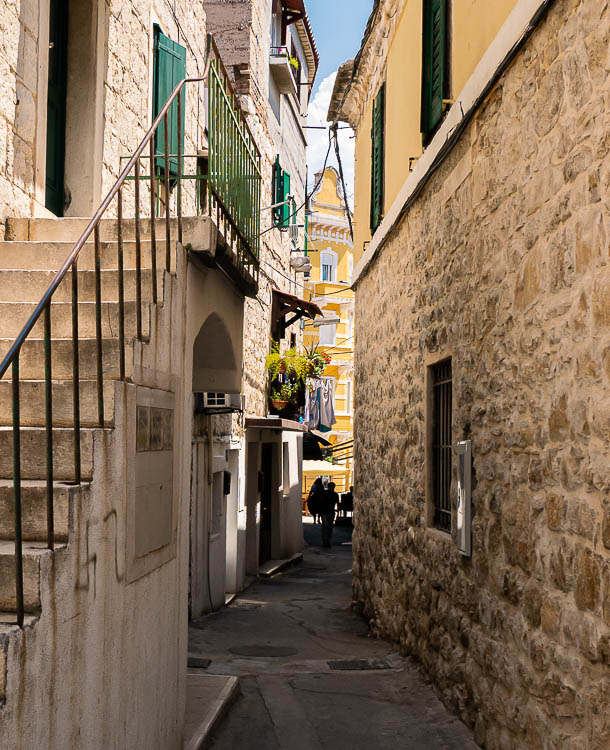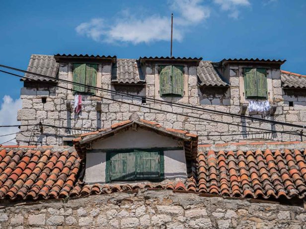 Half of the Old Town of Split exists within what was once the huge palace-fortress built for Diocletian. Many of the houses show a combination of ancient stone and brickwork with new doors, shutters, windows, or balcony railings.