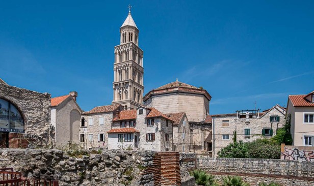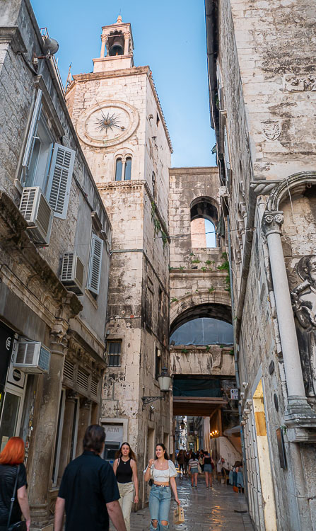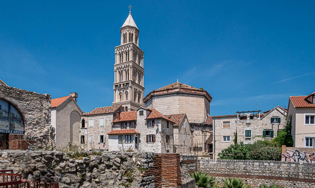 Anyway come for a walk with me and you’ll see what I mean. From the Silver Gate we wander down a long boulevard paved with smooth stones. There are crumbling ruins on the one hand, and classical Renaissance buildings on the other. On the left is the hexagonal mausoleum, a part of the original Roman structure, later converted into the Cathedral of St Domnius. In a wonderful piece of divine irony Diocletian was the last emperor of the Roman Empire to persecute Christians and his mausoleum was converted into a Christian cathedral. Just beyond it is the 12th century Romanesque bell tower of the cathedral.
