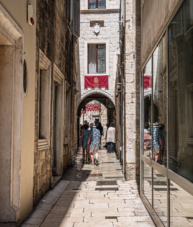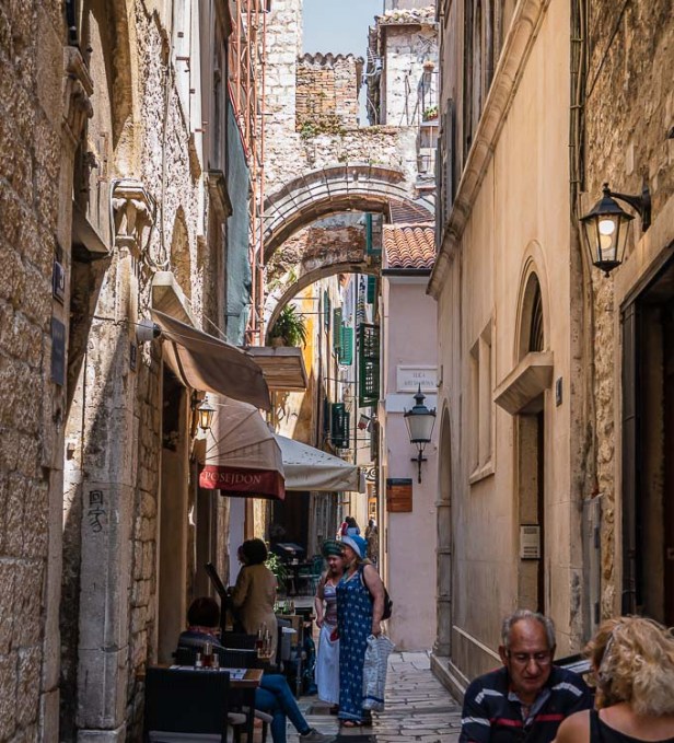 Along the boulevard 20th century cafes covered with bright canvas awnings compete with some free-standing columns, the building they once supported long gone. Exploring further we discover throughout this “palace” and the Old Town of Split a unique mixture of Roman, Medieval and Renaissance architecture. Sometimes it’s difficult to separate them as layers were built upon layers over the centuries. Roman ruins became the foundations of Medieval buildings, which created the typical narrow streets of weathered flagstone in place of the original huge palace-fortress complex.