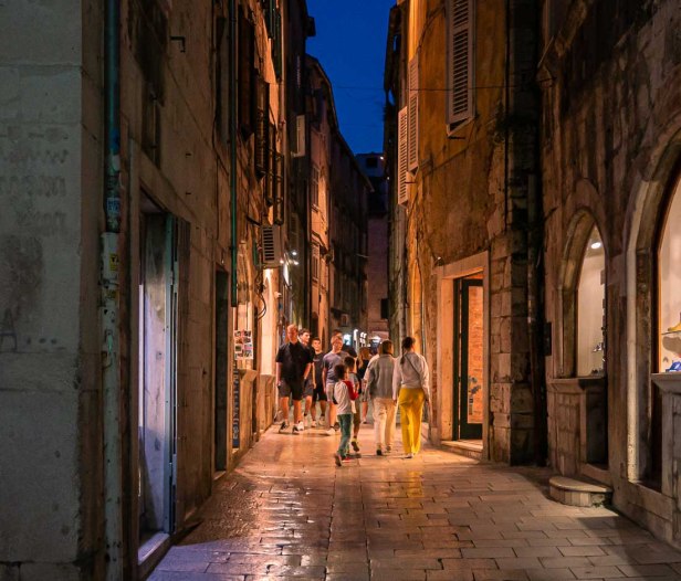 Split is no exception. Seeing the Roman ruins that are still standing after all these years shows how remarkable they are. Even more remarkable to me are the Medieval buildings in all the old areas of Split – Lučac, Varoš, and the Old Town that’s both within and beyond the original palace walls – these buildings that are upwards of 400 years old and still habitable, still inhabited. What’s it like to live in a building so old, so steeped in history? What’s it like to live in a renovated one next to one that isn’t and one that never will be? What’s it like to live amongst so much history? Being an Aussie living in Canada I have no idea how that would be, so I’m fascinated by all these glimpses. I hope you are too. Here’s another – a stroll home through the Old Town as evening falls and we head back to our apartment, buying groceries for dinner along the way. Ordinary life in an extraordinary place.