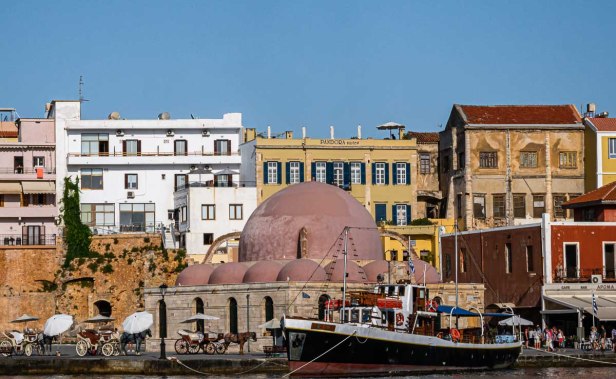 And so there is the Küçük Hasan Pasha mosque constructed after the conquest of Chania by the Ottoman Empire in 1645. As seems to be the habit of conquerors the world over, it was built over the remains of the place of worship of the vanquished culture, in this case a Christian temple. But times change, and in 1939 its minarets were demolished, and it has been used ever since as a museum, a storehouse, a museum again, a visitor centre, and an exhibition hall. I want to see inside but it’s closed.