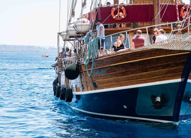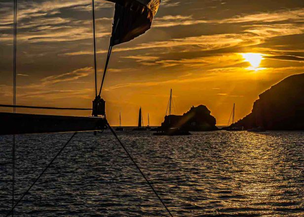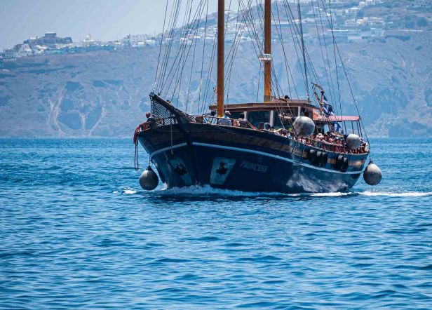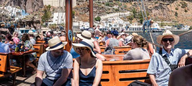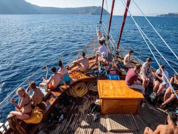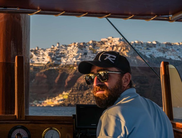and we all climb aboard; it’s a sunset cruise of Santorini’s famous caldera!