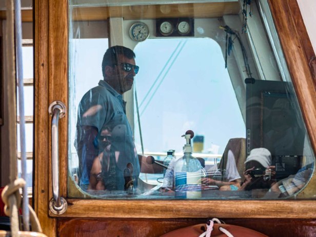 I ask the DJ if he could turn the volume down a bit, but he won’t. So, being captive, I decide to just accept it, but it’s not what we signed up for, especially when we’ve been promised traditional Greek music. Surprise! You’re on a party boat!