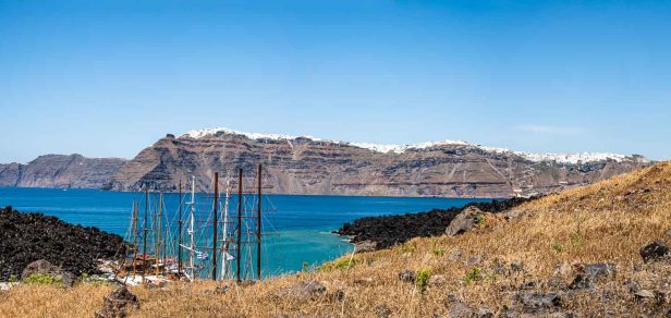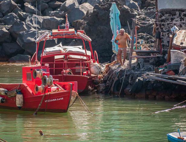 It took some internet sleuthing to discover what I was looking at. It’s the home of a (somewhat, but not completely) hermit named Sostis Arvanitis and his giant German shepherd, and all I can say is that I wish we had taken a tour of the caldera with him on one of his fishing boats. He does tours from time to time, but only if he likes you, and only if he feels like it. In his sixties, this fisherman and ex-sailor has chickens, and goats that he milks for making feta, and he grows various vegetables in the rich volcanic soil. Reports say he’s the only human inhabitant of the island, leaving behind his “trouble with women – she tried to kill me”, but I notice there’s a woman in one of the yellow boats. A visitor? Or perhaps he’s changed his mind about women. It happens. When you meet the right one.
