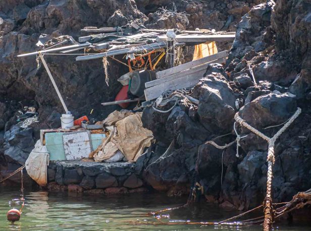 Off to one side there’s a collection of “stuff”, handy treasures no doubt – ropes, various plastic barrels and containers, canvas tarps – all of it with a dilapidated “roof”. What is it all? Who does it belong to, and why?