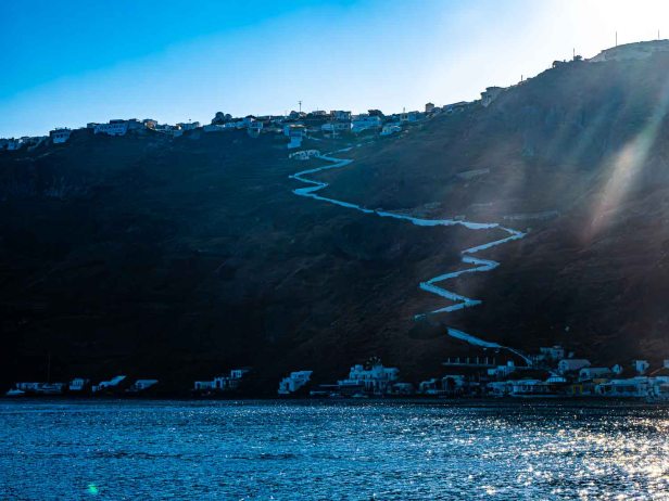 and a view back to Fira on the main island of Santorini. On our first day in Santorini we walked down that zig-zag staircase to Gialos, the tiny port by the water snugged up close against the rocky cliff.