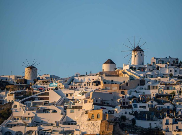 As we come nearer to Oia, the village at the north end of crescent-shaped Santorini,