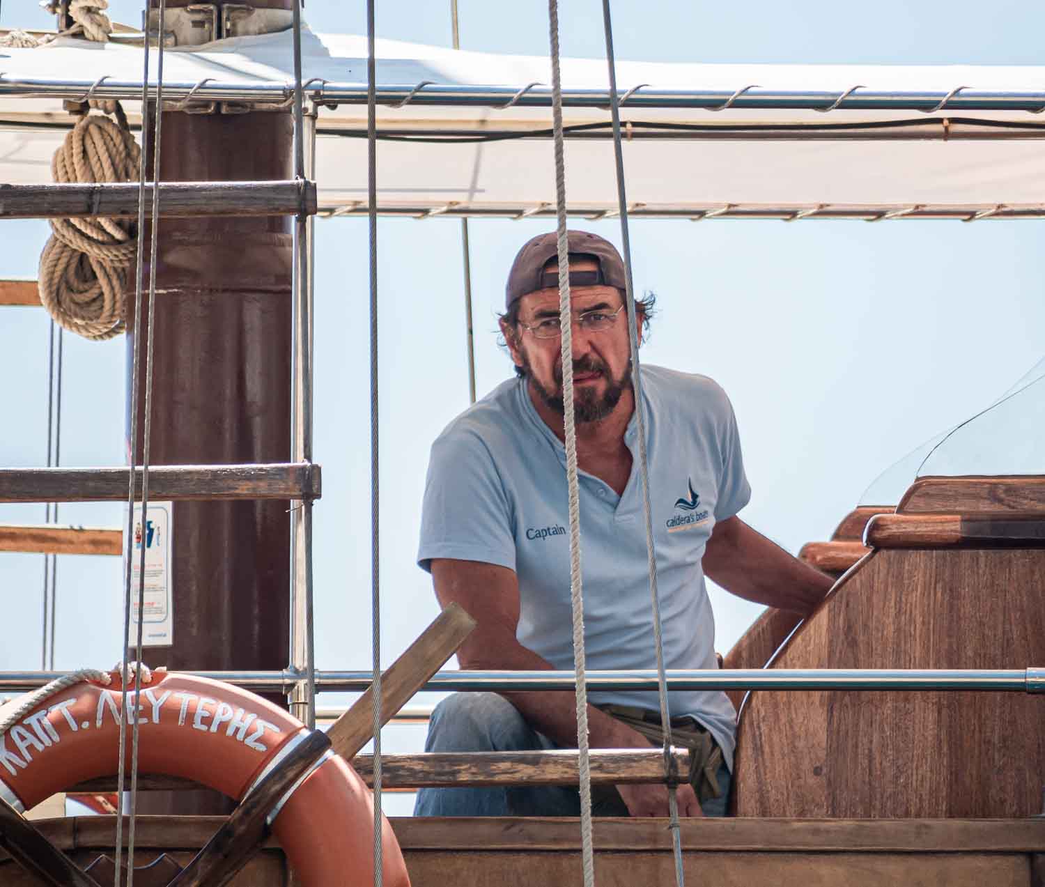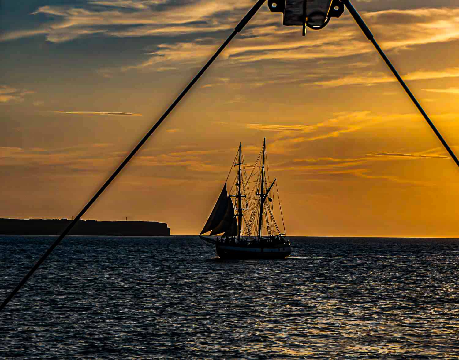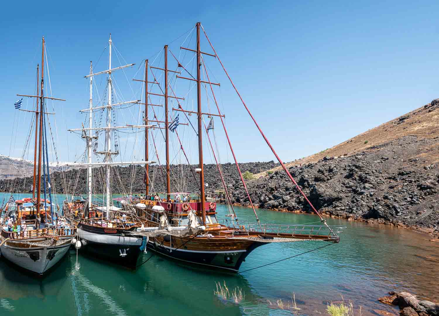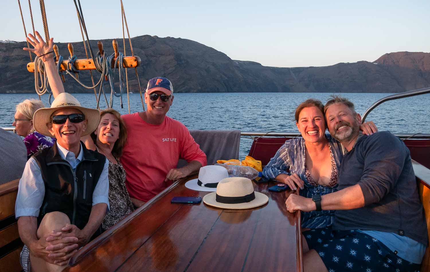 and we all climb aboard; it’s a sunset cruise of Santorini’s famous caldera!