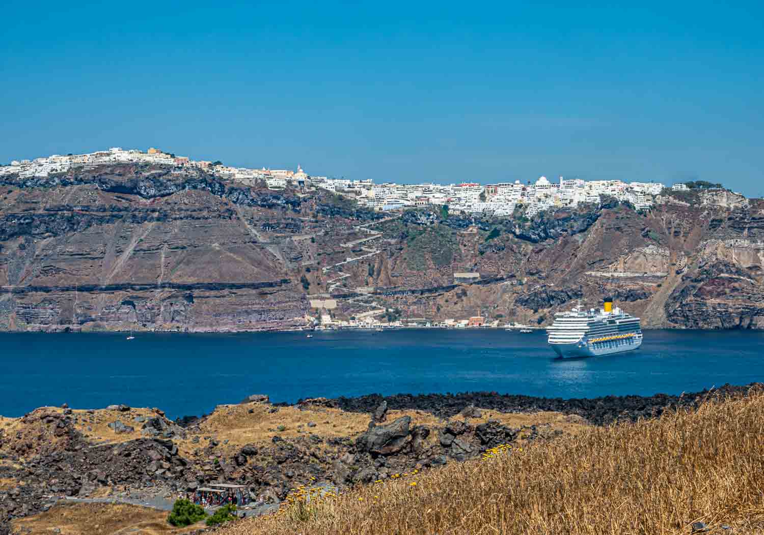 The events of the cruise are complete and slowly the boat starts to move again. We have one last look at the village of Oia sprinkled along the clifftop like sugar,