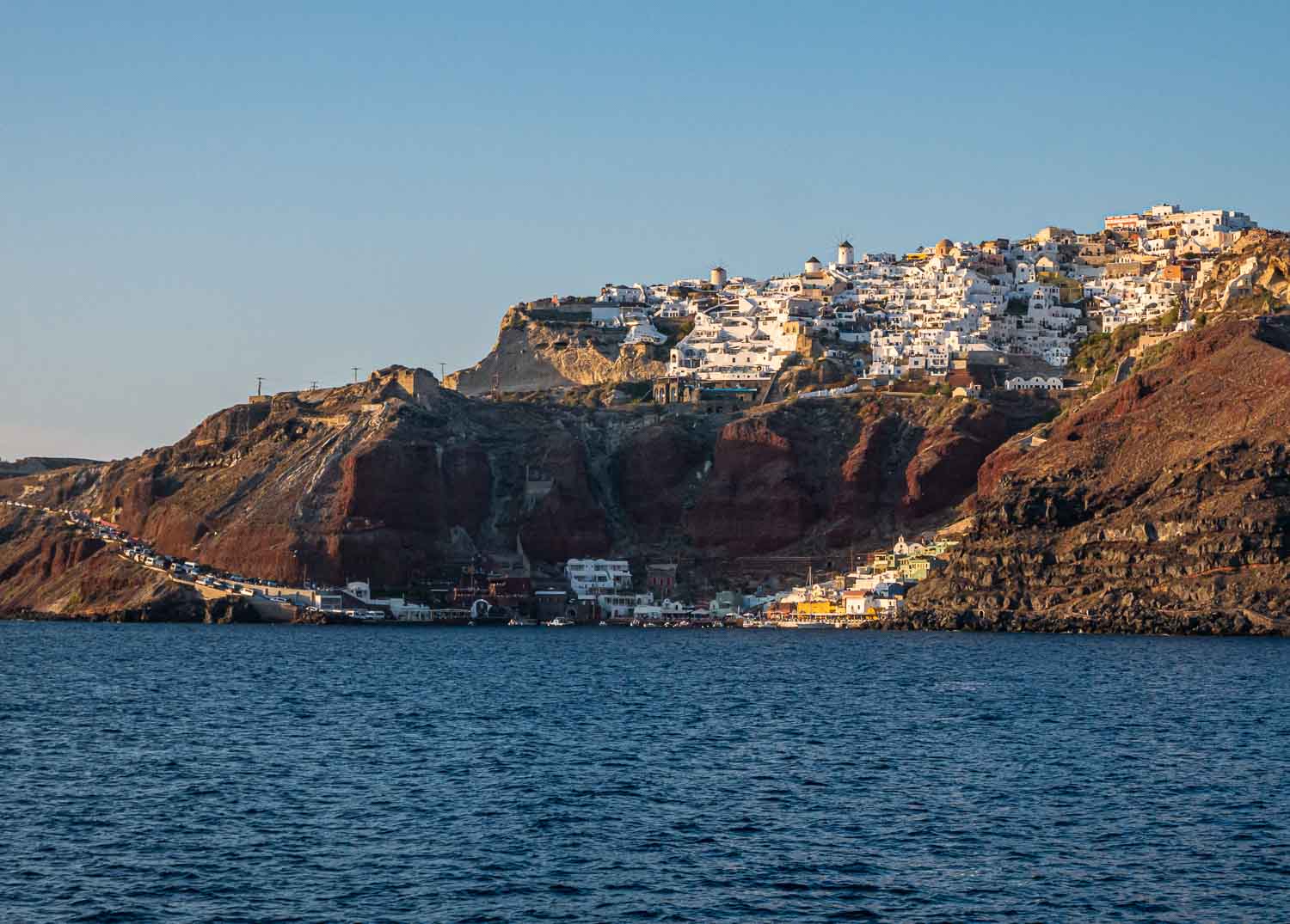 and a view back to Fira on the main island of Santorini. On our first day in Santorini we walked down that zig-zag staircase to Gialos, the tiny port by the water snugged up close against the rocky cliff.