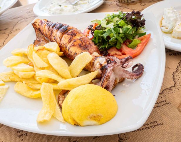 Lunch is fabulous – Greek salad with the usual huge chunk of feta, tzatziki, whole grilled calamari, fresh bread.