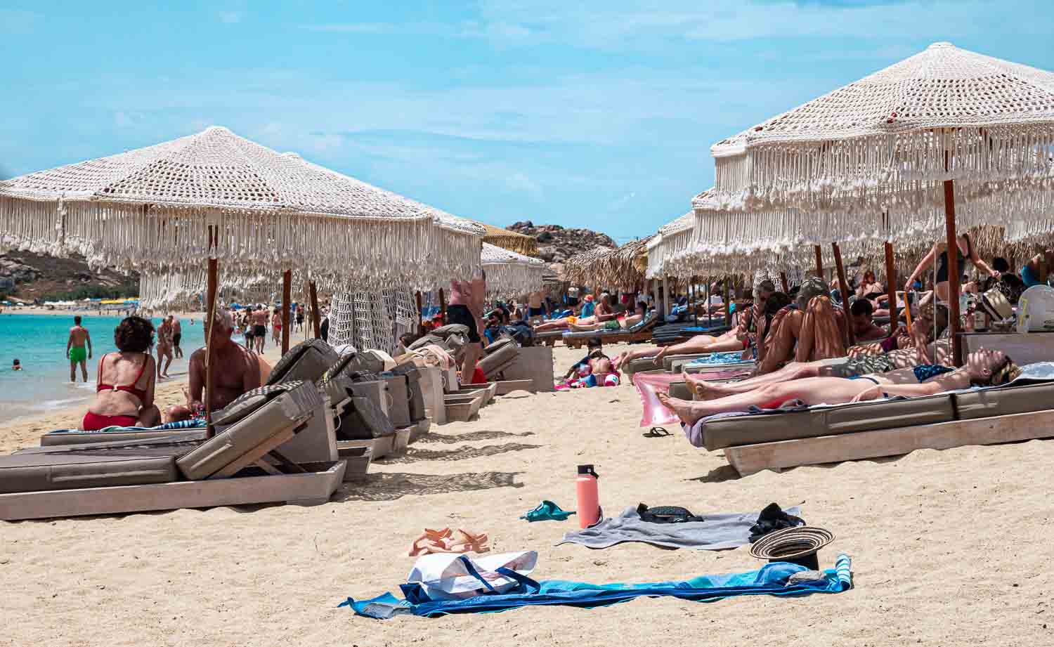 From my notes: 12 June 2022. A day at the beach. We take the bus from Chora to Agios Prokopios Beach. We search along the endless row of sun beds, all perfectly lined-up like soldiers:
