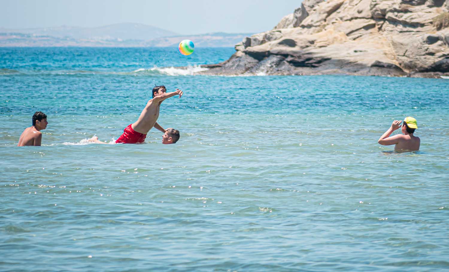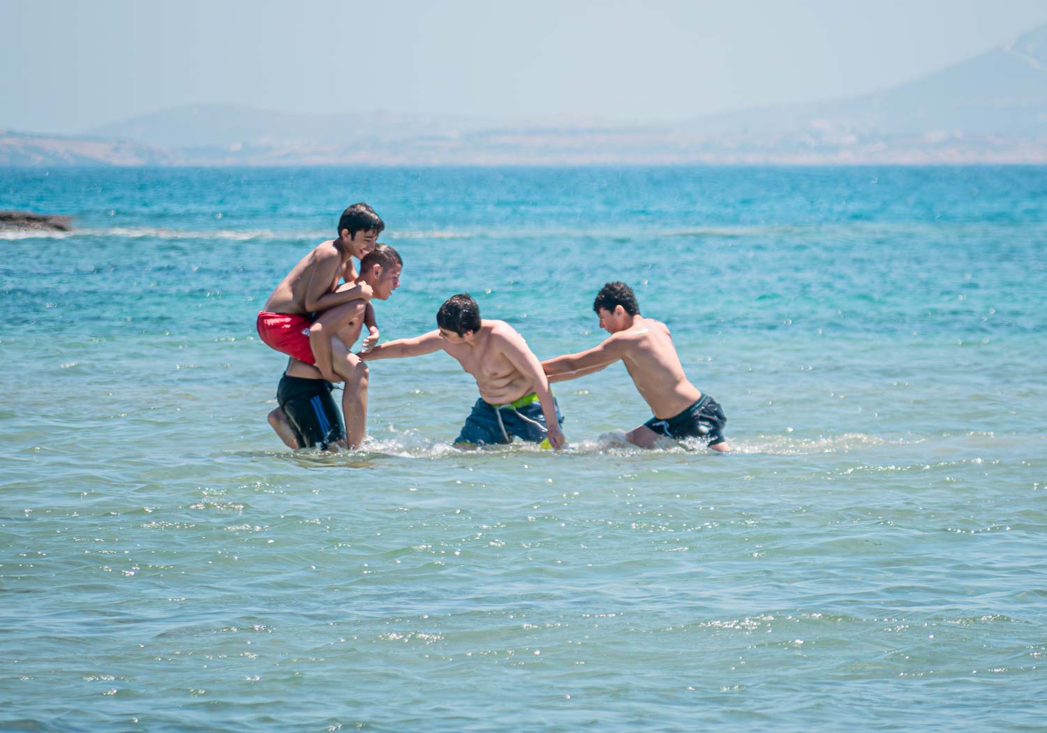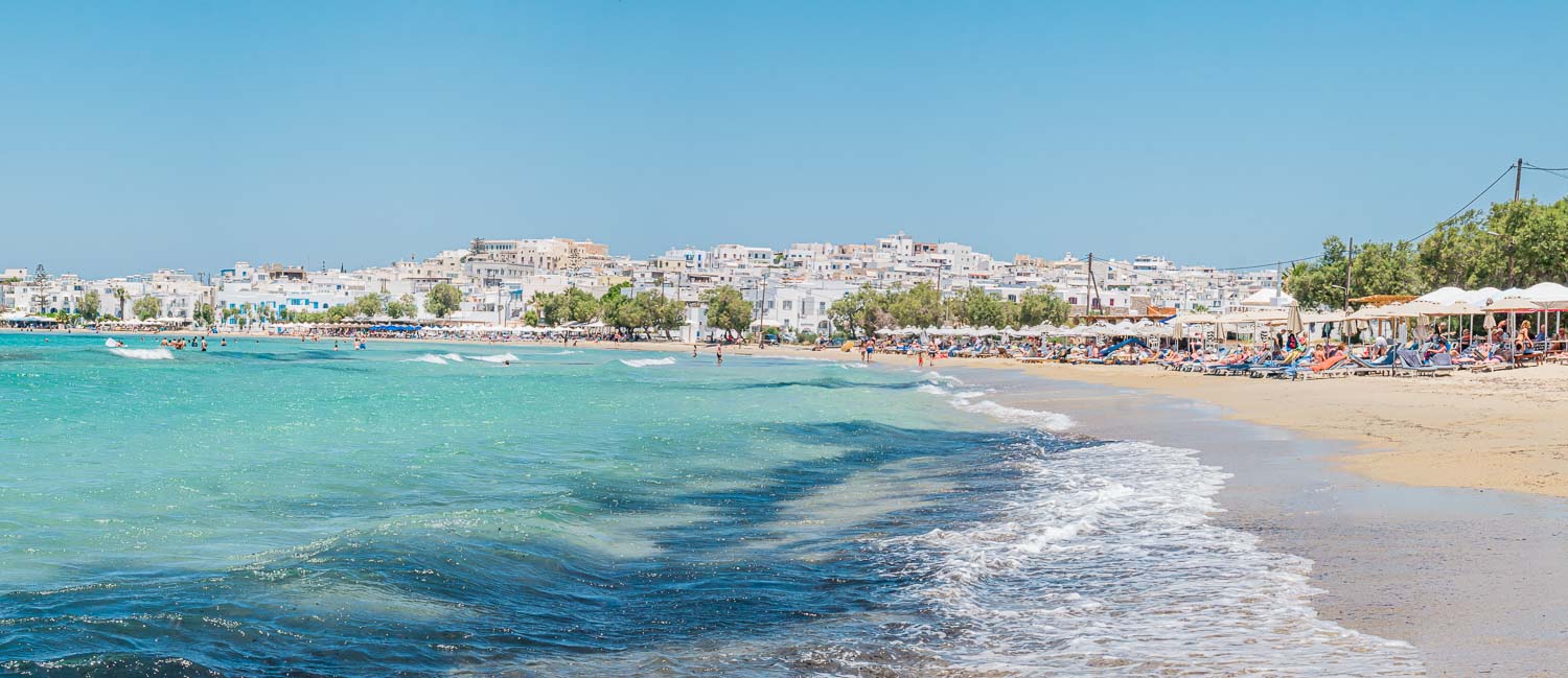 Two days later we pay for our accommodation at Studios Stratos (one of the best deals in Greece at under 40 Euros a night), put our luggage into storage, and walk to Agios Georgios, the local town beach, and hang out until it’s time to get the evening ferry to Milos. Everybody knows it, I’m sure, but Greece has beaches to swoon over. Just by standing on a beach in the Cyclades the shoulders relax, the heart opens, and a smile slowly emerges until it’s a full-on grin. There’s a sad little city beach in Split, Croatia (sorry Croatia). Split has much to recommend it, but the beach is not it. The city beach in Chora is a whole other thing. Looking towards the town,