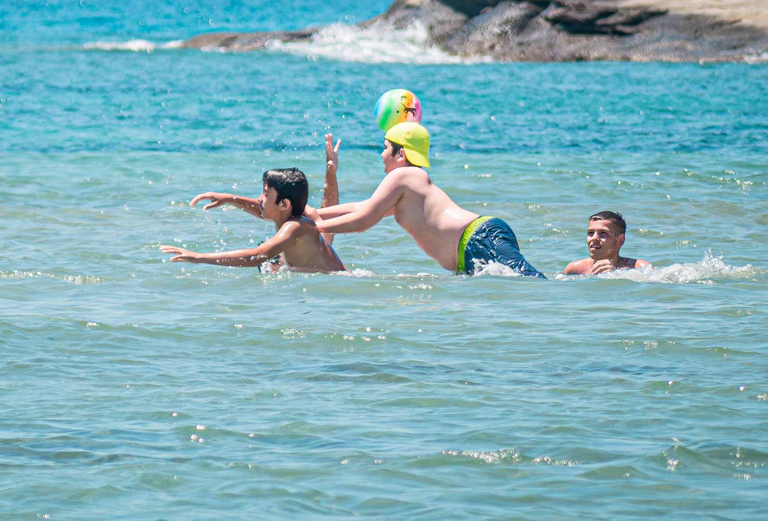 Once again we find sun beds for 10 Euros each and laze the time away, paddling, walking, and people watching. Everyone on this beach, it seems, has more energy than we do, but it’s fun to watch them at it.