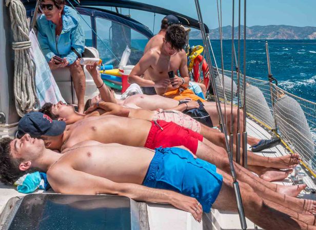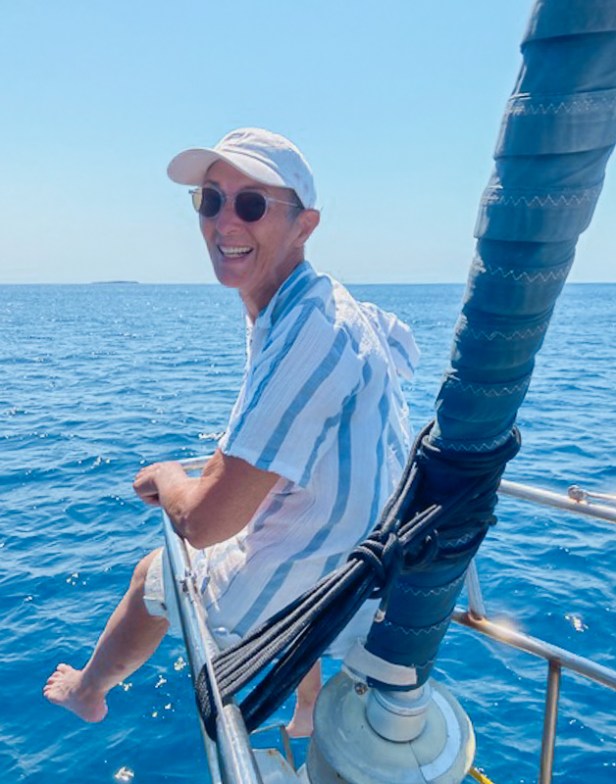 It’s the best day. It’s one of those days when everyone is happy. How could we not be? Sailing around this beautiful island on a brilliant day, the light glinting off the water, the water so blue it’s almost too dazzling to look at. We are all enchanted, contented, delighted with everything.