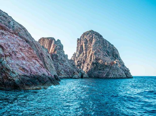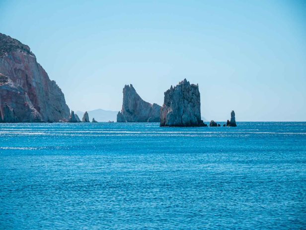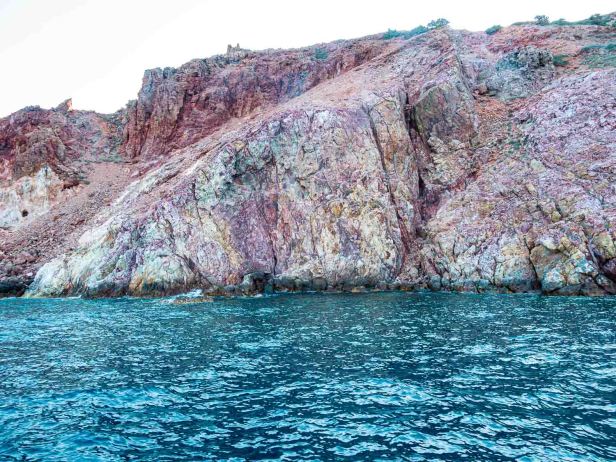 Soon we come to the island of Polyaigos, off the east coast of Milos, all pink rock and jagged outcrops,