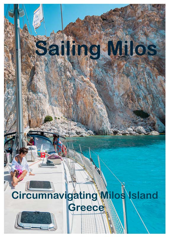 We’re on a sail boat doing a circumnavigation of the island of Milos, one of the islands of the Cyclades, the Greece of the travel posters. It’s not a true circumnavigation; wind and weather mean we start with a bus trip from Adamantas to Pollonia, thus cutting off the northern peninsula and north coast of the island, and a chance to see the unique rock formations of Sarakiniko from the water. I’m mildly disappointed, but once on board it hardly matters.