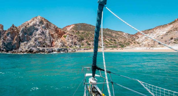 Leaving Gerakas, we continue sailing the south coast of Milos, passing by Tsigrado Beach. I think a person must truly desperately want to get to this beach given that the only way down to it is through a narrow opening by ladder, then a very steep sandy trail with a rope to hold on to, then another ladder, all the while somehow negotiating a bag or backpack full of beach necessities. And then when you arrive there are no facilities and hardly any shade.