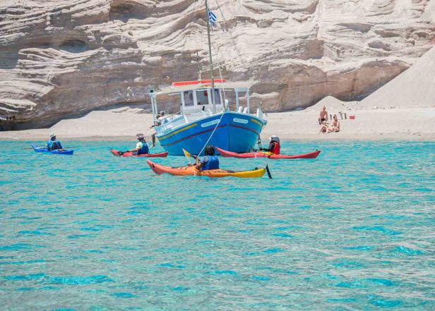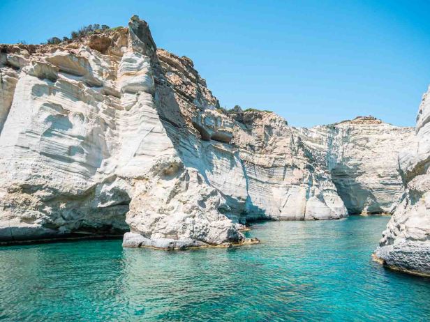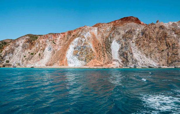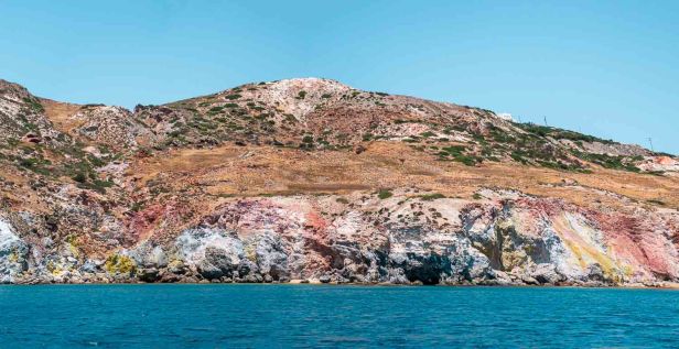 The coast of Milos is an ever-changing landscape of colour, from pink to orange and the bright yellow of sulphur.