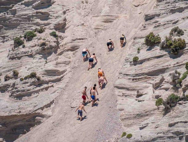 Once anchored, Dora, our intrepid guide, swims ashore and suddenly starts climbing a hill of sand. Soon most of the guys are following her.