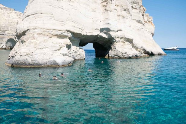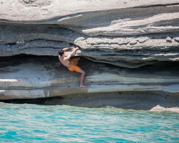 Traversing the waters of the south coast we finally come to Kleftiko, where the landscape is completely different again. This is one of the most famous “beaches” of Milos, though it is not a beach at all but a spectacular meeting of land and sea, and where the rock formations speak to us of the infinite variety and splendour of nature, but also of secret pirate hideouts, and untold assignations. It is not surprising that many pirates in the 15th-17th centuries had Kleftiko as their prime attack location for its good visibility of merchant ships travelling through the Aegean Sea. We, however, get to simply enjoy it. Lucky us!