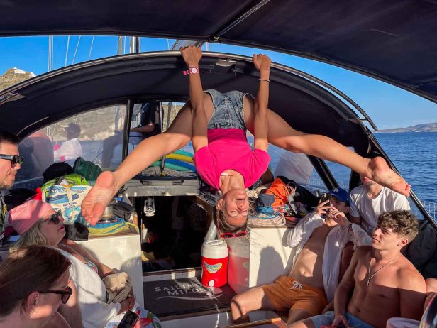 The colors look so incredible. I guess that’s what inspired the Greeks when they created their national flag. The shades of blue are amazing, and the white and pink cliffs make such a beautiful contrast. I could almost feel the sea breeze through your photos! And what a character Dora sounds like! You really picked the best day to go sailing.