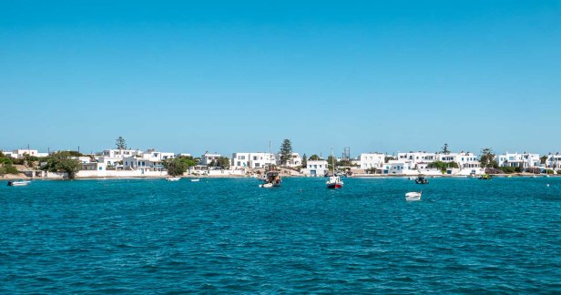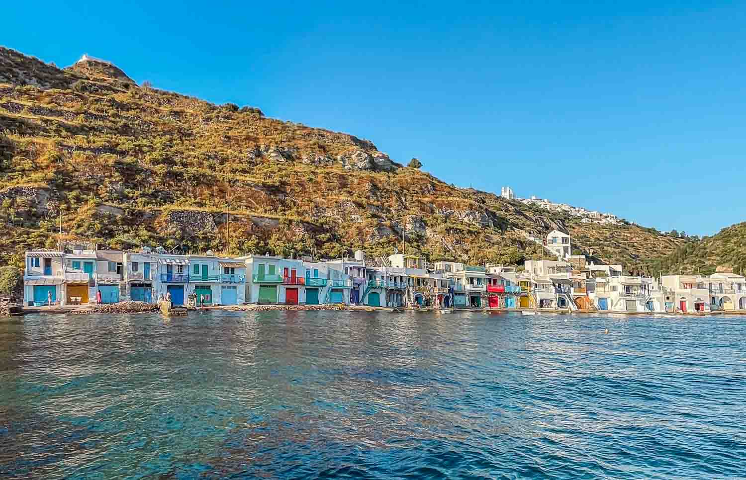Finally, as golden hour approaches, we pass by Klima, a village of fishermen’s houses carved into the rocks where they store their boats against winter weather, each garage door a different bright colour so they can be seen from the sea.