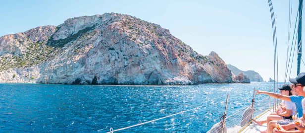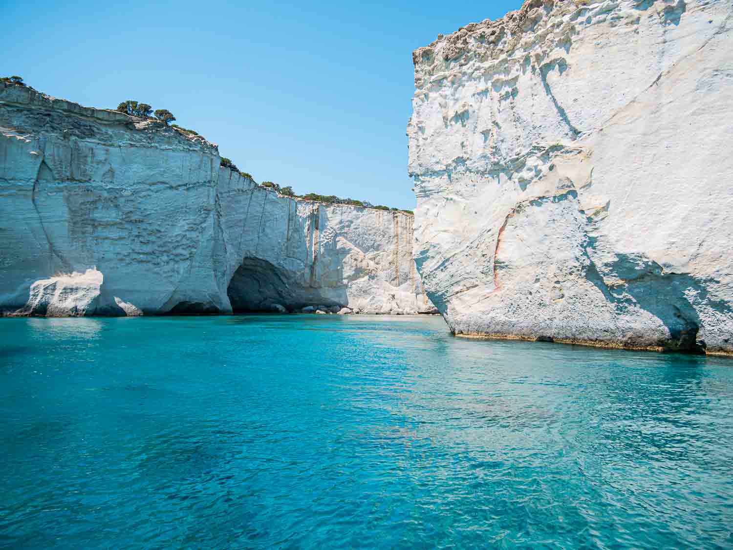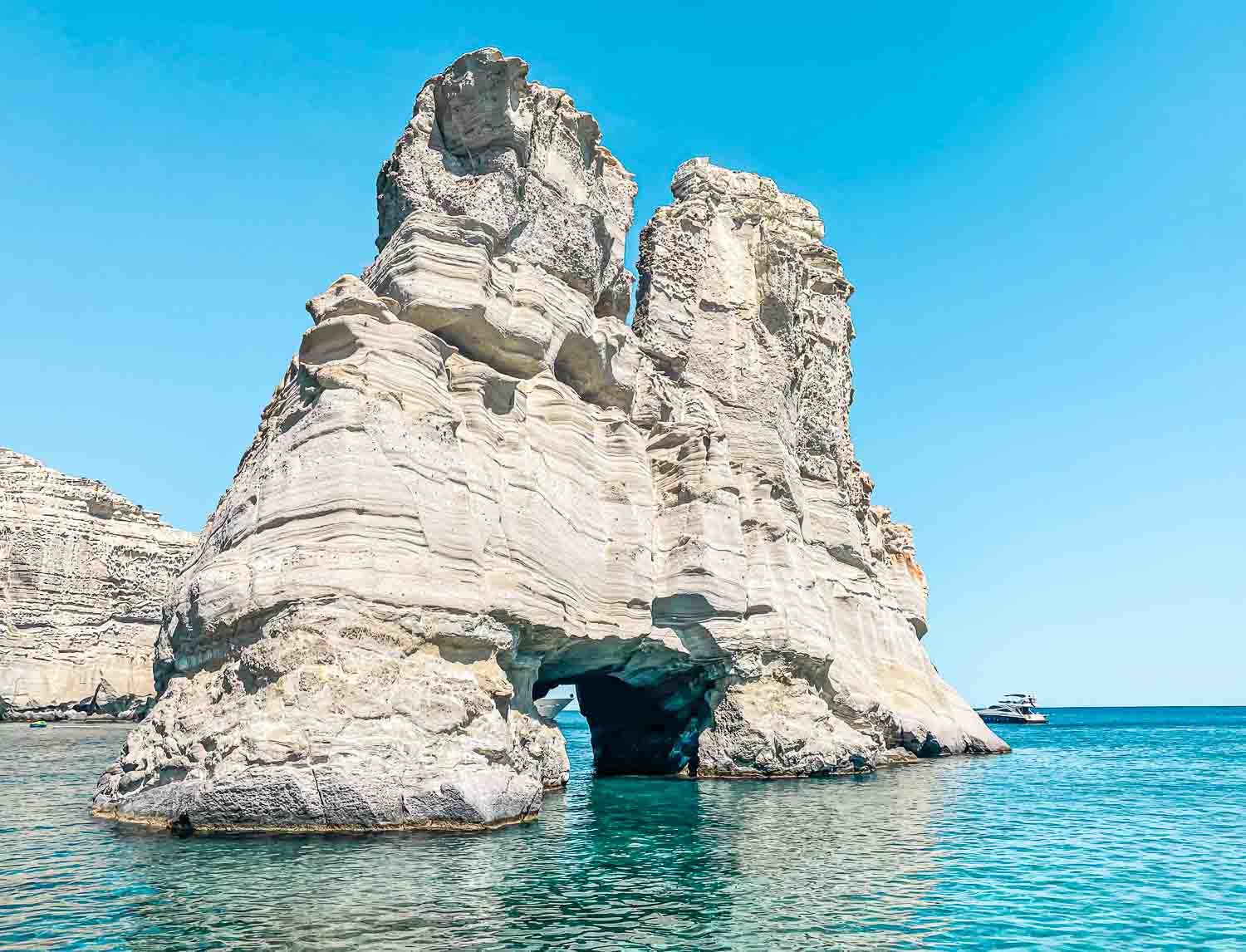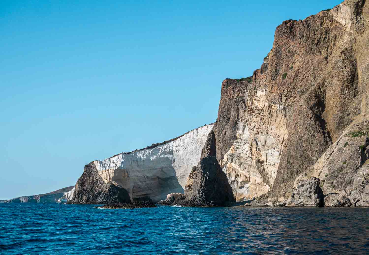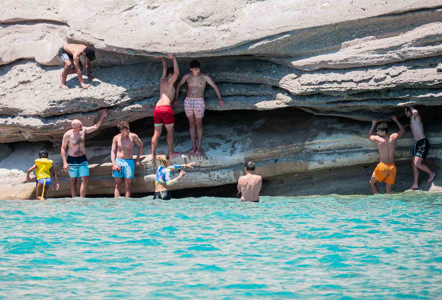 Traversing the waters of the south coast we finally come to Kleftiko, where the landscape is completely different again. This is one of the most famous “beaches” of Milos, though it is not a beach at all but a spectacular meeting of land and sea, and where the rock formations speak to us of the infinite variety and splendour of nature, but also of secret pirate hideouts, and untold assignations. It is not surprising that many pirates in the 15th-17th centuries had Kleftiko as their prime attack location for its good visibility of merchant ships travelling through the Aegean Sea. We, however, get to simply enjoy it. Lucky us!