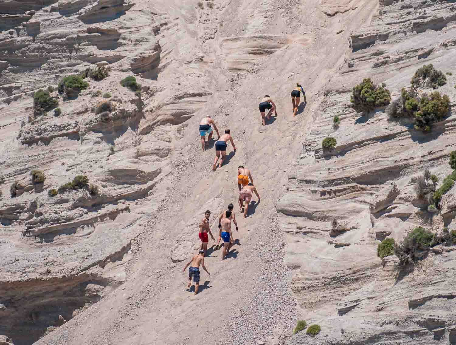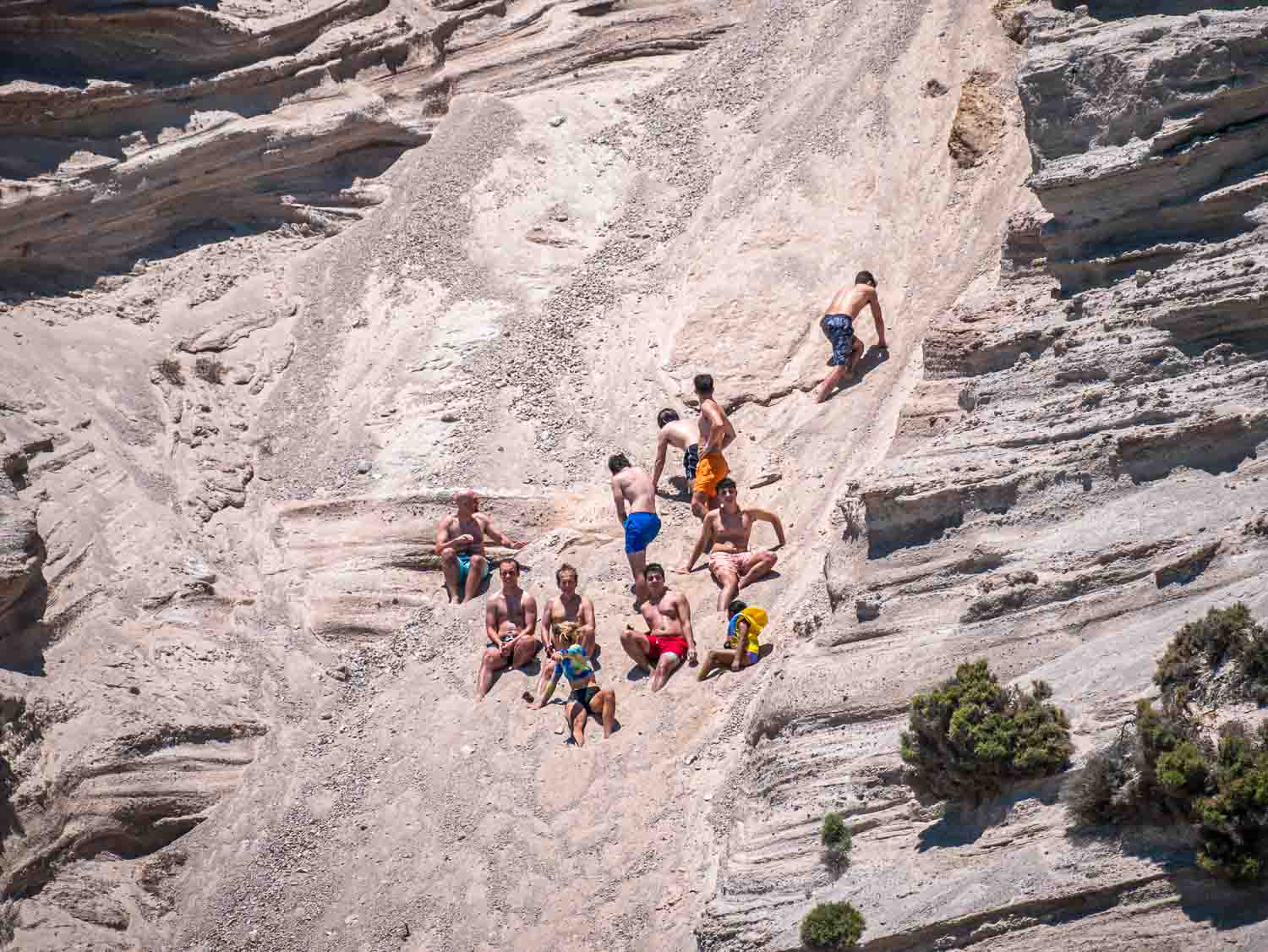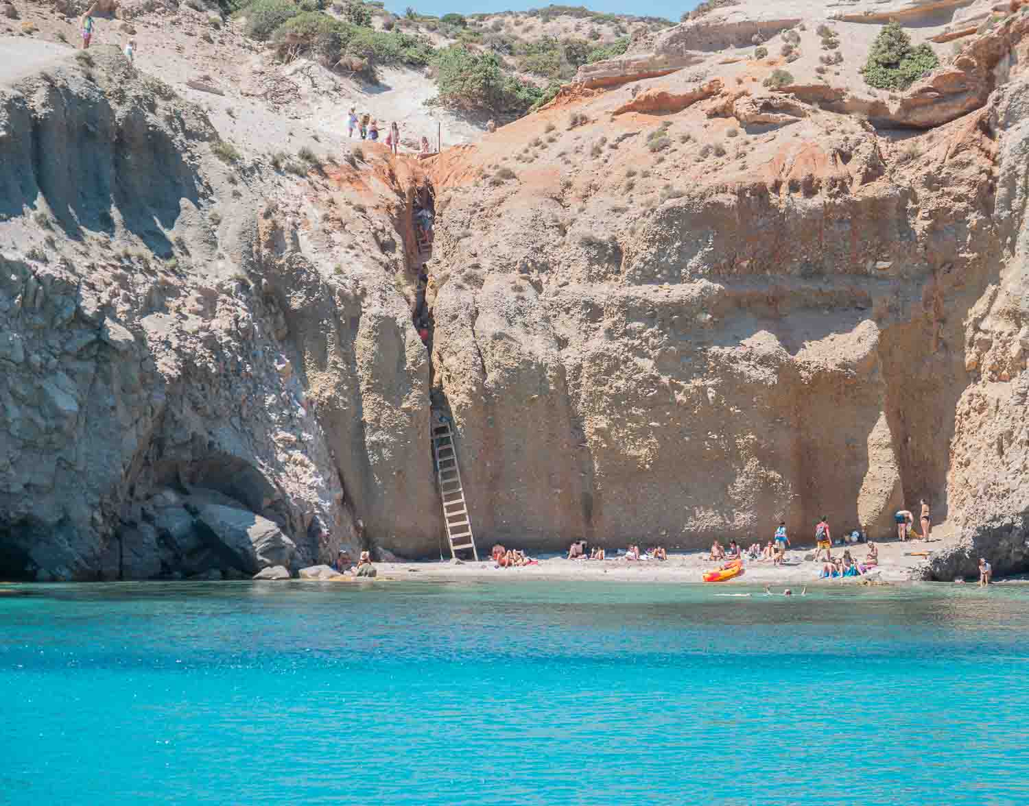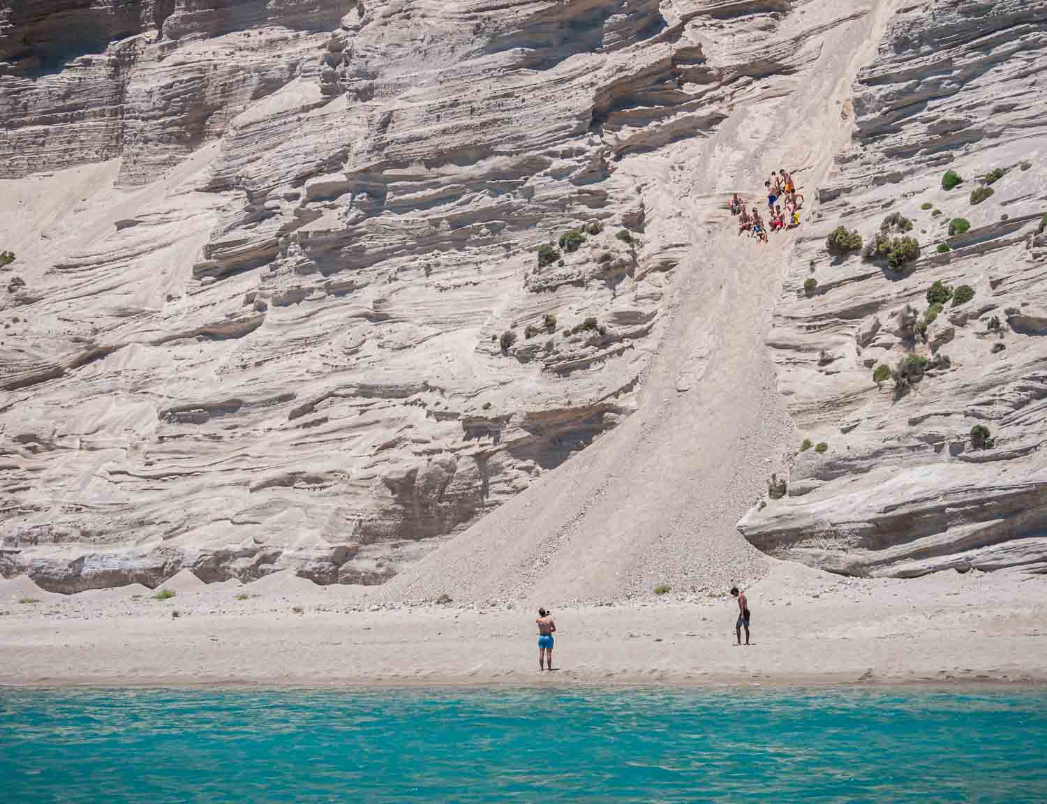 Leaving Gerakas, we continue sailing the south coast of Milos, passing by Tsigrado Beach. I think a person must truly desperately want to get to this beach given that the only way down to it is through a narrow opening by ladder, then a very steep sandy trail with a rope to hold on to, then another ladder, all the while somehow negotiating a bag or backpack full of beach necessities. And then when you arrive there are no facilities and hardly any shade.