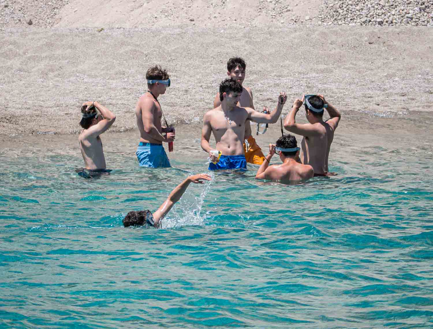 Continuing on we come to Gerakas, accessible only by boat, and the best beach of the day. Neither Don nor I swim here, but it turns out that watching everyone is plenty fun enough.
