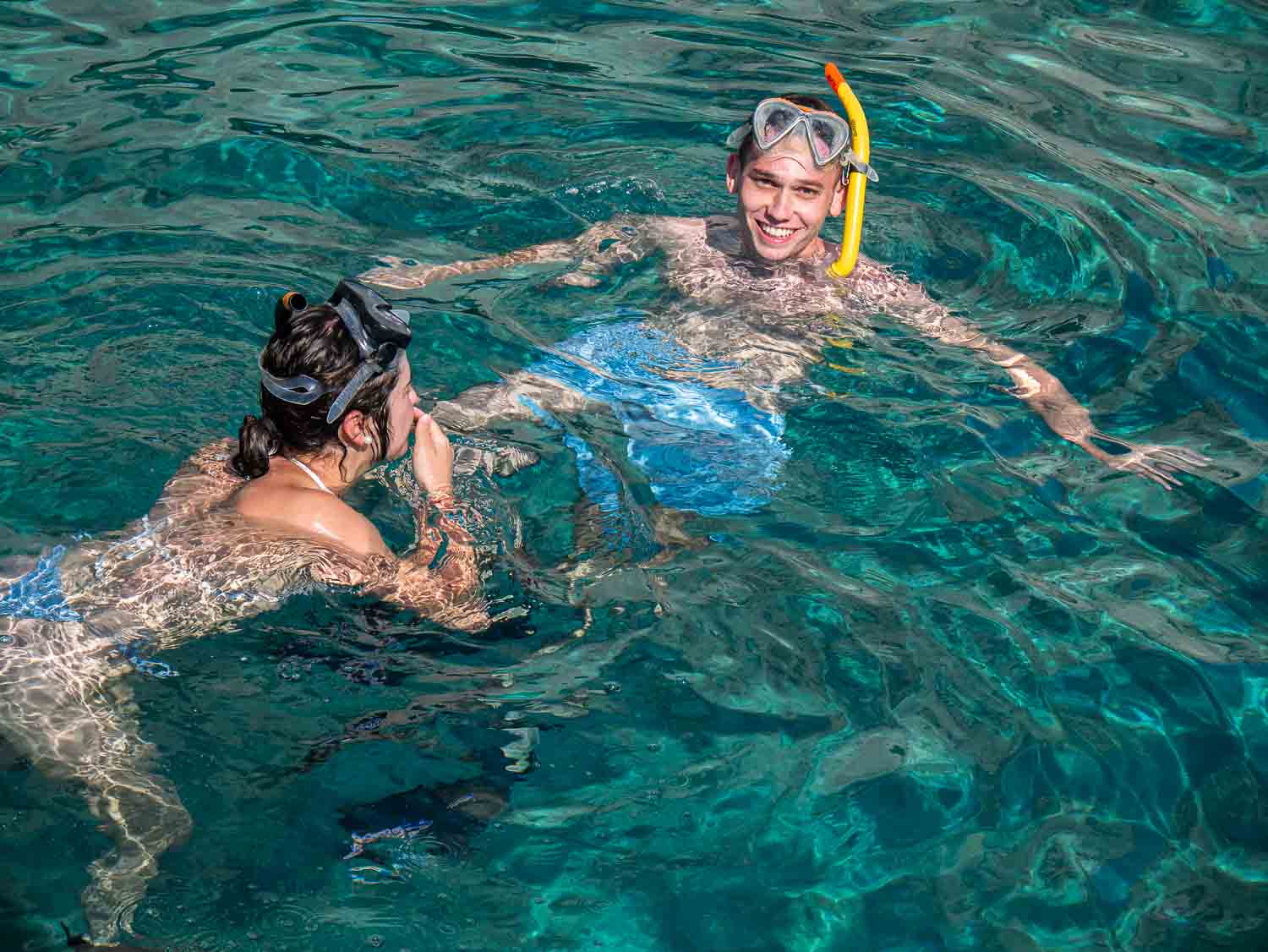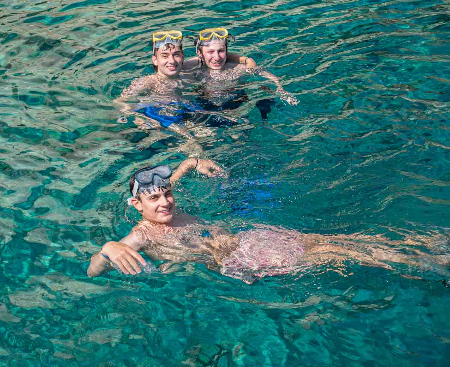 where we swim in the pristine waters of the appropriately named Blue Bay,